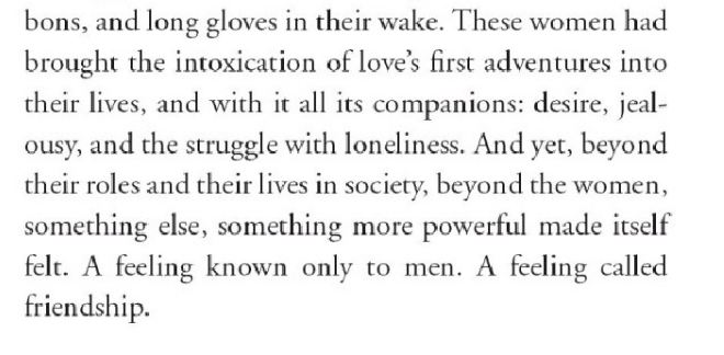 این زنان سرمستی اولین ماجراجوییهای عشق را به زندگیشان آورده بودند، با تمام متعلقاتش: تمایل، حسادت و تقلا با تنهایی. در عین حال، فراتر از نقشها و زندگیشان در جامعه، فراتر از زن بودن، یک چیز دیگر، احساسی بسیار قویتر خودش را نشان داد. احساسی آشنا فقط برای مردان. احساسی به نام رفاقت.